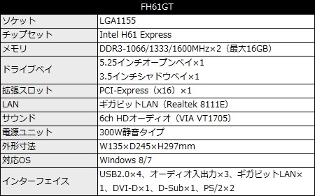 対応メモリはDDR3-1066/1333/1600MHz×2(最大16GBまで)、拡張スロットは、PCI-Express(x16)×1、オンボードグラフィックはDVI-D×1、D-Sub×1の2系統。ストレージベイは5.25インチオープンベイ×1、3.5インチシャドウベイ×1が用意される。