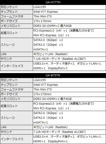 用意されるラインナップは、Intel H77 Expressチップの「GA-H77TN」とIntel B75 Expressチップの「GA-B75TN」で、TDP77WまでのLGA1155 CPUをサポート。メモリはDDR3-SO-DIMM×2で最大8GB、拡張スロットはPCI-Express3.0(x4)×1(消費電力25Wまで)、Mini PCI-Express(x1)×1で、SATAポートは「GA-H77TN」がSATA3.0(6Gbps)×2、SATA2.0(3Gbps)×2、mSATA×1、「GA-H77TN」がSATA3.0(6Gbps)×1、SATA2.0(3Gbps)×3、mSATA×1を実装する。