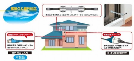 屋外で使用することを想定し、様々な保護処理が施されたLAN製品がエレコムより発表。今回リリースされたのは屋外使用に対応するLANケーブル「LD-VAPFR/BK」シリーズと、RJ45中継コネクタ「LD-VAPFR/RJ45WP」の2製品。上下階を繋ぐ配線を屋外へ誘導できるほか、既存のすき間用フラットケーブル(「LD-VAPF/SV05」)などを組み合わせることで外壁へ穴を開けることなく配線できる。