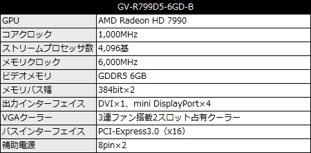 AMDのフラグシップGPU Radeon HD 7990を搭載したハイエンドグラフィックスカードの新製品。AMD CrossFireXに対応し、2枚のカードを並列処理させれば更にパフォーマンスを向上させることができる。