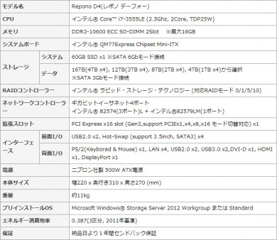 ドライブはシステム用60GバイトSSD×1とデータ用HDD×4(ホットスワップ対応)を内蔵し、容量は16TB(4TB×4)、12TB(3TB×4)、8TB(2TB×4)、4TB(1TB×4)を選択可能。またチップセット内蔵のRAID機能によりRAID 0/1/5/10をサポートする。