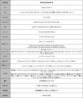 CPUにはHaswellフラグシップCore i7-4770Kを搭載し、チップセットはIntel Z87 Expressを採用。その他、DDR3 16GBメモリ(PC3-12800/8GB×2)、1TB HDD(SATA3.0/7,200rpm)、DVDスーパーマルチドライブ等で構成される。