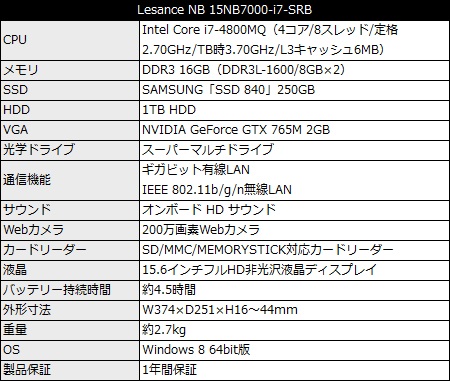 用意されるラインナップは、Core i7-4800MQ(4コア/8スレッド/定格2.70GHz/TB時3.70GHz/L3キャッシュ6MB)、16GBメモリ、250GB SSD、1TB HDD構成の最上位「Lesance NB 15NB7000-i7-SRB」(基本構成売価税込164,980円)を筆頭に、Core i7-4800MQ、8GBメモリ、120GB SSD、1TB HDD構成の「Lesance NB 15NB7000-i7-SGB」(基本構成売価税込139,980円)、Core i7-4700MQ(4コア/8スレッド/定格2.40GHz/TB時3.40GHz/L3キャッシュ6MB)、8GBメモリ、120GB SSD、750GB HDD構成の「Lesance NB 15NB7000-i7-TRB」(基本構成売価税込119,980円)の3機種。