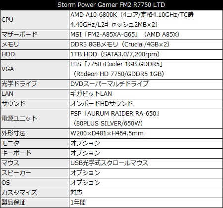 プロセッサはAMD A10-6800K(4コア/定格4.10GHz/TC時4.40GHz/L2キャッシュ2MB×2)、マザーボードはAMD A85Xチップセットを搭載したMSI「FM2-A85XA-G65」で、グラフィックスカードにはRadeon HD 7750採用のHIS「7750 iCooler 1GB GDDR5」をチョイス。