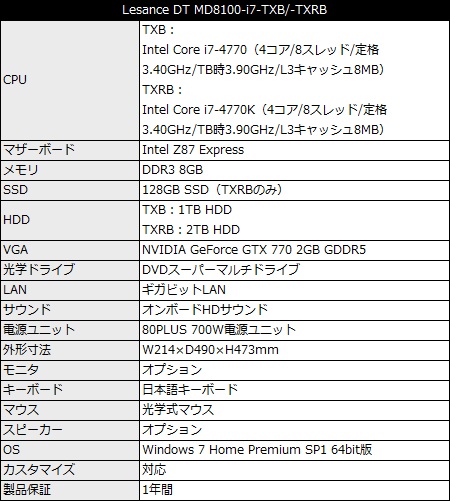 ラインナップは、Core i7-4770K、DDR3 16GBメモリ、128GB SSD+2TB HDD構成の上位モデル「Lesance DT MD8100-i7-TXRB」(基本構成売価税込189,980円)とCore i7-4770、DDR3 8GBメモリ、1TB HDD構成の下位モデル「Lesance DT MD8100-i7-TXB」(基本構成売価税込159,980円)の2機種。