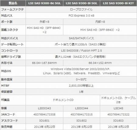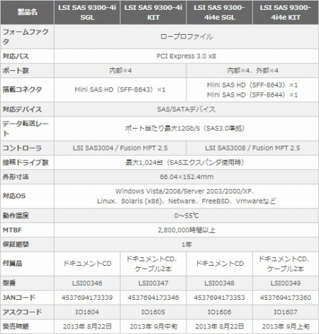 ボードラインナップは、内部4ポート「SAS 9300-4i」、内部4/外部4ポート「SAS 9300-4i4e」、内部8ポート「SAS 9300-8i」、外部8ポート「SAS 9300-8e」の4モデルで、ケーブルの有無により7製品が用意される。なお詳細はスペックは以下の通り。