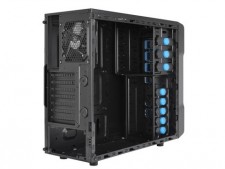 冷却システムは、リア120×120×25mm(BlueLED/1,000rpm/16dBA)×1を標準装備。オプションで、フロント120×120×25mm×1、サイド120×120×25mm×1、ボトム120×120×25mm×1、トップ120×120×25mm×2を増設可能。なおトップスペースは奥行きを設け、240mmラジエターにも対応するなど、エアフロー重視のコンセプトも同様だ。