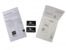 ステッカーはNSSCT(Nano Solid Surface Coating Technology)と呼ばれる特殊加工により、電磁波を吸収する仕組み。一番強く電磁波を受ける場所に貼り付ける必要があるため、パッケージには対応機種ごとのガイドシートが付属する。ステッカーは2枚封入され、機種によっては2枚とも使用するモデルもあるようだ。