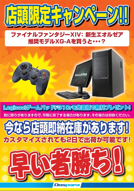キャンペーン期間中、GALLERIA「ファイナルファンタジーXIV: 新生エオルゼア」推奨PCを購入すると、もれなくロジクール製ゲームパッド「F310r」が進呈される。