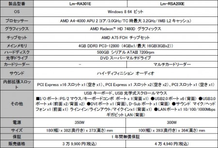 OSにWindows 8 64bitがプリインストールされた、3万円台からの低価格PC計2機種。CPUはいずれもAMDデュアルコアAPU A4-4000を搭載。チップセットはAMD A75 FCHで、グラフィックはAMD Radeon HD 7480Dを採用。DDR3 4GBメモリ、500GB HDD、DVDスーパーマルチドライブ等を標準で装備する。