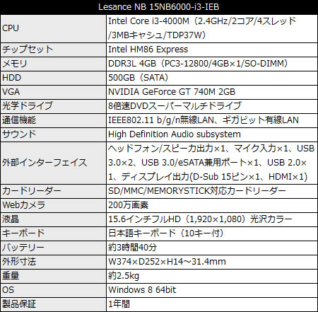 エントリーモデル「Lesance NB 15NB6000-i3-IEB」(基本構成売価税込84,980円)は、CPUにIntel Core i3-4000M(2.4GHz/2コア/4スレッド/3MBキャシュ/TDP37W)を搭載する、Intel HM86 Expressチップ構成。DDR3L 4GBメモリ、500GB HDD、8倍速DVDスーパーマルチドライブ等を装備し、通信機能はIEEE802.11 b/g/n無線LAN、ギガビット有線LANを備える。