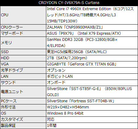 「CROYDON CY-IV6X79A-S Curtana」(基本構成売価税込399,980円)は、PCケースにSilverStone「Fortress SST-FT04B-W」を採用。CPUはIntel Core i7-4960X Extreme Editionで、マザーボードにはASUS「P9X79」をチョイス。SanMax DDR3-1600 32GB(8GB×4)、東芝HG5d採用SSD 256GB、2TB HDD等で構成される。なおOSはWindows 8 Pro 64bitで、各種カスタマイズに対応。モニタや入力デバイスは別売り。