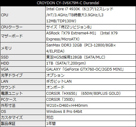 「CROYDON CY-IV6X79M-C Durandal」(基本構成売価税込216,800円)は、PCケースにCORSAIR「Obsidian 350D」を採用。CPUはIntel Core i7-4930Kで、マザーボードにはASRock「X79 Extreme4-MJ」をチョイス。SanMax DDR3-1600 32GB(8GB×4)、東芝HG5d採用SSD 128GB、1TB HDD等で構成される。なおOSはWindows 8 64bitで、各種カスタマイズに対応。モニタや入力デバイスは別売り。
