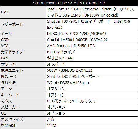 CPUにIvy Bridge-E Intel Core i7-4960X Extreme Editionを標準装備。ストレージにはCrucial「M500」960GBを搭載し、DDR3 16GB(4GB×4)、Blu-rayドライブ、AMD Radeon HD 5450等で構成される。