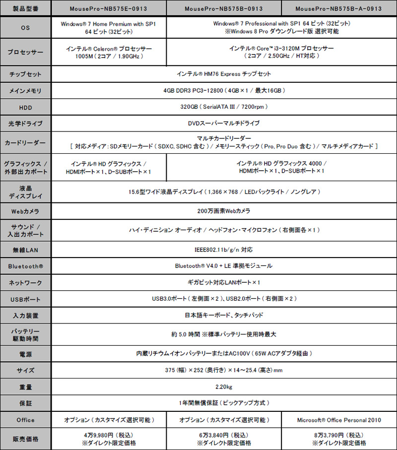 4万円台からのエントリーモデル「MousePro-NB575E-0913」(売価税込49,980円)は、CPUにIntel Celeron 1005M(2コア/1.90GHz)を搭載する、Intel HM76 Expressチップベース。DDR3 4GBメモリ(PC3-12800/4GB×1)、320GB HDD(SATA/7,200rpm)、DVDスーパーマルチドライブ等を備え、グラフィックはIntel HD Graphics(HDMI×1、D-Sub×1)を採用。OSには、Windows 7 Home Premium 64bit SP1がプリインストールされる。なお各モデル詳細仕様は以下通り。外形寸法は、W375×D252×H14~25.4mm、重量2.2kg。
