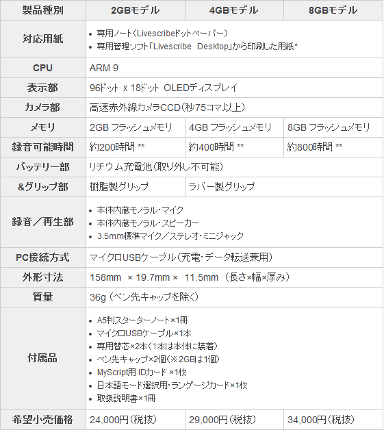 2GB、4GB、8GBの3容量がラインナップされるペンは、手書きで専用ノートに文字や絵、さらに周囲の音声を記録。デジタルデータとしてPCで管理する事ができるというもの。また、ノートに書かれた文字をタップすると、記録された箇所の音声を頭出しし、書いた時の臨場感をそのまま再生する。