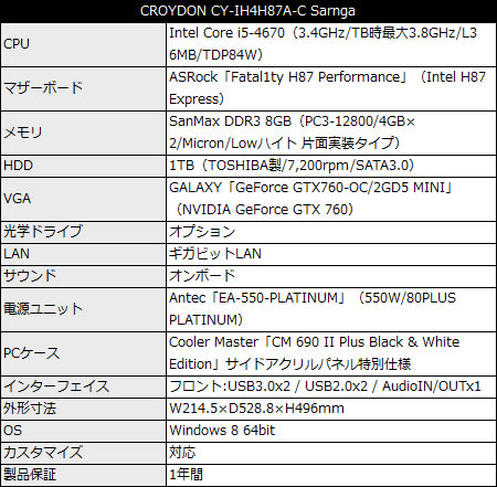その他詳細スペックは以下通りで、各種カスタマイズに対応。OSはWindows 8 64bitで、入力デバイスおよびモニタは別売り。