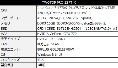 ラインナップ最上位の「TWOTOP PRO-Z87T-X」(基本構成売価税込184,980円)は、CPUにIntel Core i7-4770K(4コア/8スレッド/3.5GHz/TB時3.9GHz/キャッシュ8MB/TDP84W)、マザーボードにASUS「Z87-A」を採用。メモリはKingston製のDDR3 16GBで、ストレージはCFD「CSSD-S6T128NHG5Q」(128GB/SATA3.0)をRAID 0構成で組み込んだ。