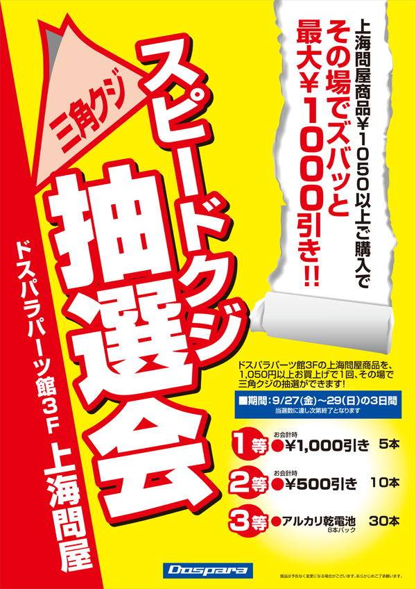 ドスパラパーツ館3階の上海問屋フロアにて、税込1,050円以上購入するとその場で最大(1等/5本)1,000円引きになる「三角クジ抽選会」が開催されている。期間は29日(日)まで。