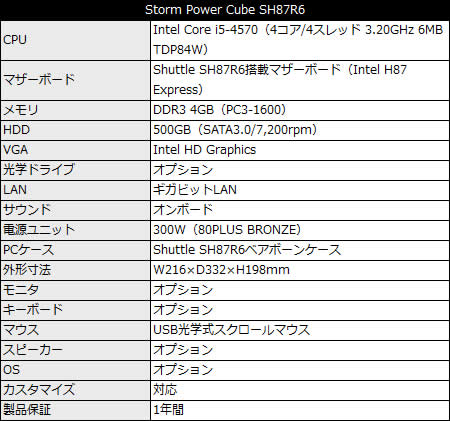 CPUにIntel Core i5-4570を採用。DDR3 4GBメモリ、500GB HDD等を標準で装備し、売価6万円台を実現した。なおOSおよびディスプレイ等は別売りで、各種カスタマイズに対応。製品保証は1年間。