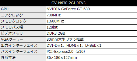 DirectX 11.1に対応したNVIDIA GeForce GT 630搭載グラフィックスカード。バスインターフェイスはPCI-Express2.0(x16)。