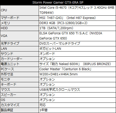 マザーボードはIntel H87 Expressチップ搭載のMSI「H87-G43」で、CPUにIntel Core i5-4670を標準装備。その他DDR3 4GBメモリ(2GB×2)、1TB HDD(SATA)、DVDスーパーマルチドライブ等を備える。