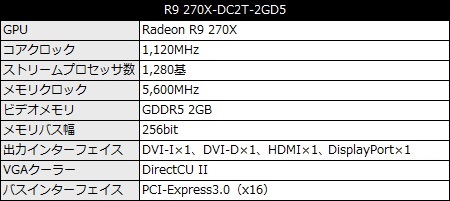 「R9 270X-DC2T-2GD5」は、アッパーミドルGPU、Radeon R9 270X搭載モデル。ストリームプロセッサは1,280基、コアクロック1,120MHz、メモリクロック5,600MHzで、メモリバス幅256bit、GDDR5 2GBメモリを実装する。