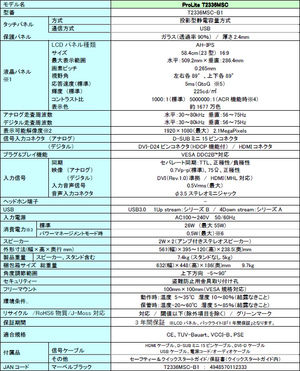 解像度は1,920×1,080ドット、視野角は水平/垂直89度、輝度225cd/m2、コントラスト比5,000,000:1(ACR時)で、液晶表面には硬度7H、厚さ2.4mmの強化ガラス保護パネルを搭載。インターフェイスはDVI-D×1、HDMI×1、D-Sub×1、φ3.5mmステレオミニジャックで、2W×2スピーカーを内蔵する。