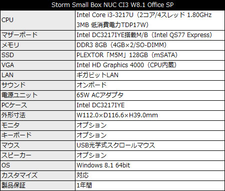 OSにWindows 8.1 64bitを、ソフトウェアにMicrosoft Office Personal 2013をプリインストールさせた、Intel NUC「DC3217IYE」ベースの省スペースBTO。