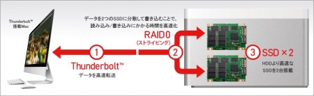 バッファローから、Thunderbolt接続に対応した外付けSSDの新製品「SSD-WAT」シリーズがリリースされた。2台のSSDをストライピング(RAID0)構成で内蔵することで、標準的なUSB3.0 HDDの4.4倍となる763MB/secの高速な転送速度を実現している。