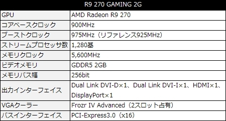 出力インターフェイスはDual Link DVI-D×1、Dual Link DVI-I×1、HDMI×1、DisplayPort×1の4系統。バスインターフェイスはPCI-Express3.0(x16)。同社が提供する簡易OC機能「GAMING APP」に対応する。