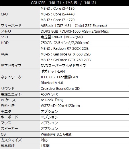CPUとグラフィックスカードで差別化を図り、Core i3-4130とRadeon R7 260Xを採用した「GOUGER GU-IH2Z87-M83「M8-i3」」、Core i5-4440とGeForce GTX 660構成の「GOUGER GU-IH4Z87-M85「M8-i5」」、Core i7-4770とGeForce GTX 760構成の「GOUGER GU-IH4Z87-M87「M8-i7」」の3モデルがラインナップされる。