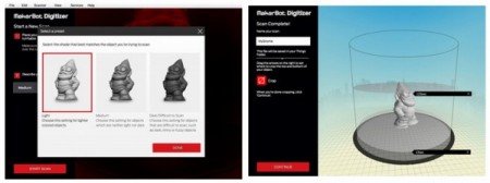 測定対象物は直径203×高さ203mm、重量3kgまでに対応。2個のラインレーザーと130万画素のCMOSセンサーで読み取る仕組みで、約20万ポリゴンの頂点データをシームレスにデジタルメッシュデータとして出力できる。また、測定物をスキャナーの回転テーブルにセットした後は、PCから3D専用ソフト「MakerWare for Digitizer」を起動し“2クリック”するだけと簡単。自動的にわずか12分程度で3Dプリントに必要なスキャンデータを作成できる。