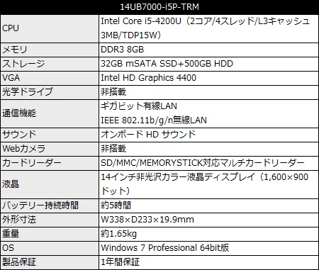 主なスペックは、CPUがCore i5-4200U(2コア/4スレッド/L3キャッシュ3MB/TDP15W)で、DDR3 8GBメモリ、32GB mSATA SSD、500GB HDD等で構成され、光学ドライブは非搭載。