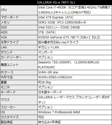 基本構成売価税込419,970円の「GALLERIA XG-e 780Ti SLI」は、CPUにIntel Core i7-4930Kを搭載。チップセットはIntel X79 Expressで、DDR3 32GBメモリ(8GB×4)、Intel SSD 530シリーズ240GB+3TB HDD、読み書き対応Blu-rayドライブ等を標準で備える。