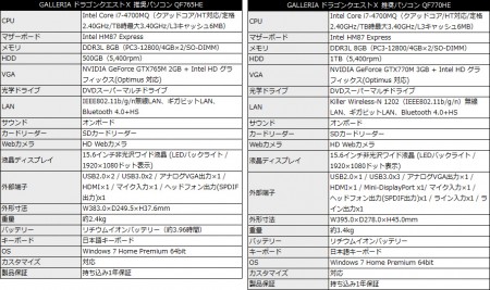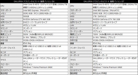 上位の「GALLERIA ドラゴンクエストⅩ 推奨パソコン DT」(基本構成売価税込109,980円)は、グラフィックスカードをNVIDIA GeForce GTX 760 2GBのアップグレード。HDD容量も1TBに倍増されている。なお両モデル共にOSにはWindows 7 Home Premium 64bitがプリインストールされる。