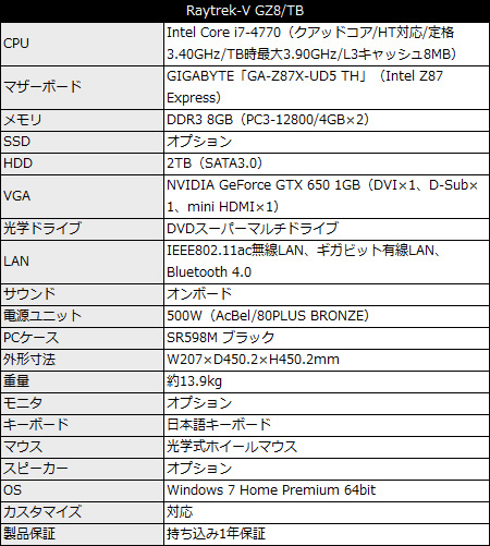 CPUはIntel Core i7-4770で、メモリ容量はDDR3 8GB(4GB×2)。ストレージは2TB HDDが標準で、グラフィックスカードにはNVIDIA GeForce GTX 650 1GBが搭載される。