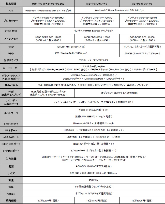 用意されるラインナップは、Core i7-4800MQと32GBメモリを搭載し、4K2K対応32インチディスプレイ「PN-K321」を同梱したフラッグシップモデル「MB-P9300X2-WS-P32GZ」(基本構成売価税込579,600円)を筆頭に、Core i7-4700MQ、16GBメモリ構成の「MB-P9300X-WS」(基本構成売価税込198,870円)、Core i5-4200M、8GB構成の「MB-P9300S-WS」(基本構成売価税込168,000円)の3モデル。