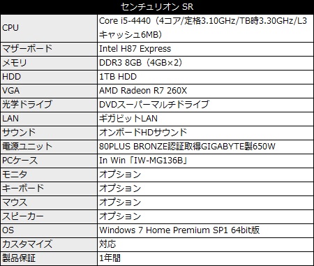 CPUはCore i5-4440(4コア/定格3.10GHz/TB時3.30GHz/L3キャッシュ6MB)、チップセットはIntel H87 Expressで、DDR3 8GBメモリ(4GB×2)、1TB HDD、DVDスーパーマルチドライブ等で構成。