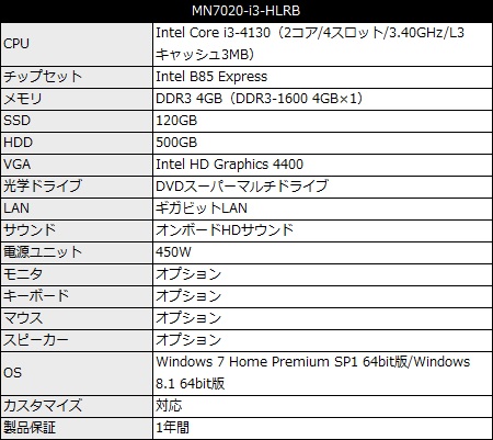 その他チップセットはIntel B85 Express、グラフィックはCPU統合のIntel HD Graphics 4400で、DDR3 4GBメモリ(4GB×1)、DVDスーパーマルチドライブを標準装備。OSはWindows 7 Home Premium 64bit版またはWindows 8.1 64bit版が選択でき、BTO方式による各種カスタマイズにも対応する。