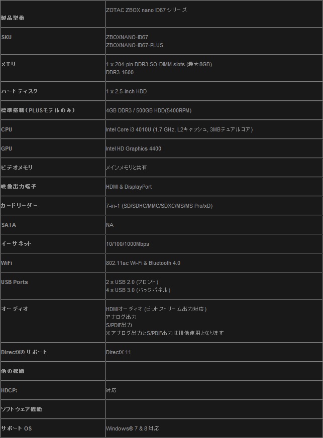 製品ラインナップはベアボーンキットの「ZOTAC ZBOX nano ID67」と、500GB HDDと4GBメモリを内蔵した「ZOTAC ZBOX nano ID67 Plus」の2種。外形寸法は、W127×D45×H127mm。対応OSはWindows 8/7。