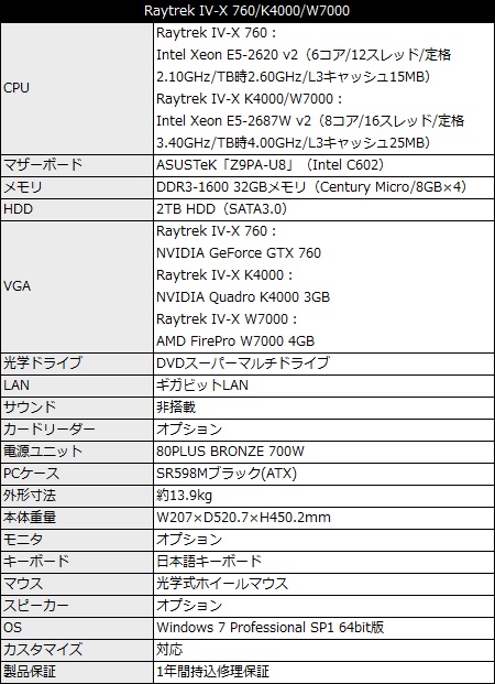 用意されるラインナップは、Xeon E5-2620 v2(6コア/12スレッド/定格2.10GHz/TB時2.60GHz/L3キャッシュ15MB)、NVIDIA GeForce GTX 760 2GB構成の「Raytrek IV-X 760」をベースに、Xeon E5-2687W v2(8コア/16スレッド/定格3.40GHz/TB時4.00GHz/L3キャッシュ25MB)、NVIDIA Quadro K4000 3GB構成の「Raytrek IV-X K4000」、Xeon E5-2687W v2、AMD FirePro W7000 4GB構成の「Raytrek IV-X W7000」の3モデル。