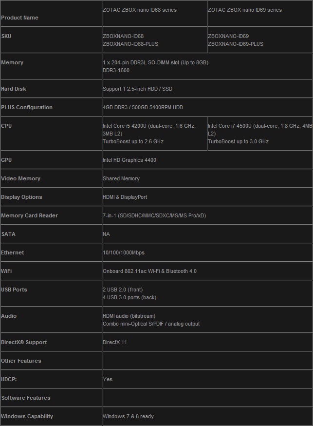 ラインナップは、Core i7-4500U(2コア/4スレッド/定格1.80GHz/TB時3.00GHz/L3キャッシュ4MB/TDP15W)標準の「ZBOX nano ID69」シリーズと、Core i5-4200U(2コア/4スレッド/定格1.60GHz/TB時2.60GHz/L3キャッシュ3MB/TDP15W)の「ZBOX nano ID68」シリーズの2シリーズで、500GB HDDと4GBメモリを内蔵した「Plus」モデルも用意される。
