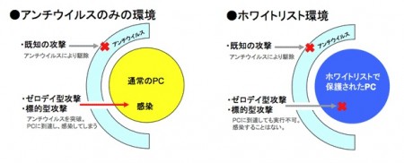 管理者が登録したファイルやスクリプトのみを実行できるようにする“ホワイトリスト”方式を採用することで、脆弱性を利用したマクロやウイルスなどの実行を阻止して、サポート期限後でもWindows XP環境を安全に運用することができる。