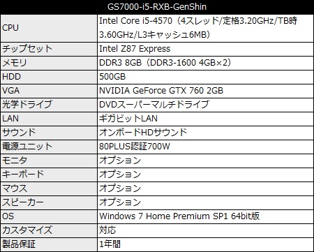 主なスペックは、Intel Z87 ExpressチップベースのCore i5-4570(4スレッド/定格3.20GHz/TB時3.60GHz/L3キャッシュ6MB)構成で、グラフィックカードにはNVIDIA GeForce GTX 760 2GBを搭載。その他、DDR3 8GBメモリ、500GB HDD、DVDスーパーマルチドライブ等を備える。