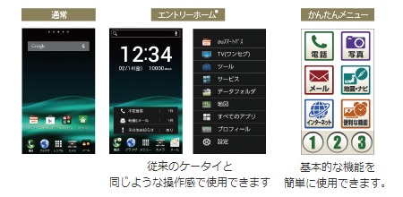 “初心者にも優しい”をコンセプトに開発された京セラ製スマートフォン「URBANO」シリーズの新作。標準的なホーム画面の他、文字が大きくわかりやすい「エントリーホーム」と機能を簡単に選択できる「かんたんメニュー」の3種類のホーム画面を搭載。スマートフォンの熟練度や使いやすさに応じて自由に切り替えることができる。