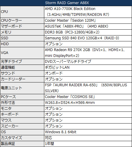 ストレージはSamsung SSD 840 EVO 120GB×4台をRAID 0構成。その他DDR3 8GB(4GB×2)メモリ、DVDスーパーマルチドライブ等を備え、各種カスタマイズにも対応する。