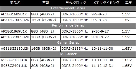 メモリプロファイルは「AMD Memory Profile」(AMP)と「eXtreme Memory Profile」(XMP)の両対応。動作クロックは1,600MHz、1,866MHz、2,133MHz、2,400MHzの4種類で、メモリ容量は8GB(4GB×2)と16GB(8GB×2)が用意される。なお取り扱いモデルの詳細スペックは以下の通り。