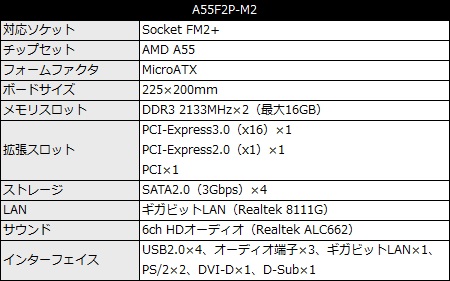 Socket FM2+対応エントリー向けチップセット、AMD A55を搭載するMicroATXマザーボードの新製品。同社の独自耐久基準「Durathon」に準拠。湿気に強い高密度PCBや電解コンデンサの6倍の寿命を誇る固体コンデンサ、ESD保護機能などを備えることで、高い耐久性と信頼性を実現した。