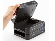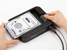 HDDはスライドして設置するだけのシンプル仕様で、収納式のガイドを立てることで2.5インチHDDにも対応する。また、レバーを押して手軽に取り外しできる脱着機構を採用、コネクタへの負担も少ない。インターフェイスは高速なUSB3.0に対応し、大容量の動画やデータもストレスなく読み書きできる。